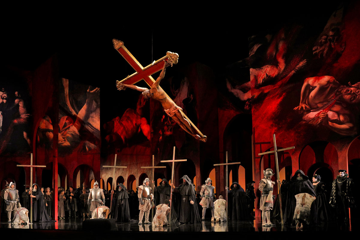 Through to the bottom of the cast list, a strong display of vocal talent came from members of the Domingo-Colburn-Stein Young Artist Program with Taylor Raven as Tebaldo, Joshua Wheeker as Count Lerma and Liv Redpath as the Celestial Voice. Further gifting the ear, a resonating swell of voices combined magnificently under Chorus Director Grant Gershon’s command, giving the processional Auto-da-fé scene tremendous grandeur - and it looked a menacing reminder as Christ on the Cross looked down in judgement - even though the scene’s realisation looked static.